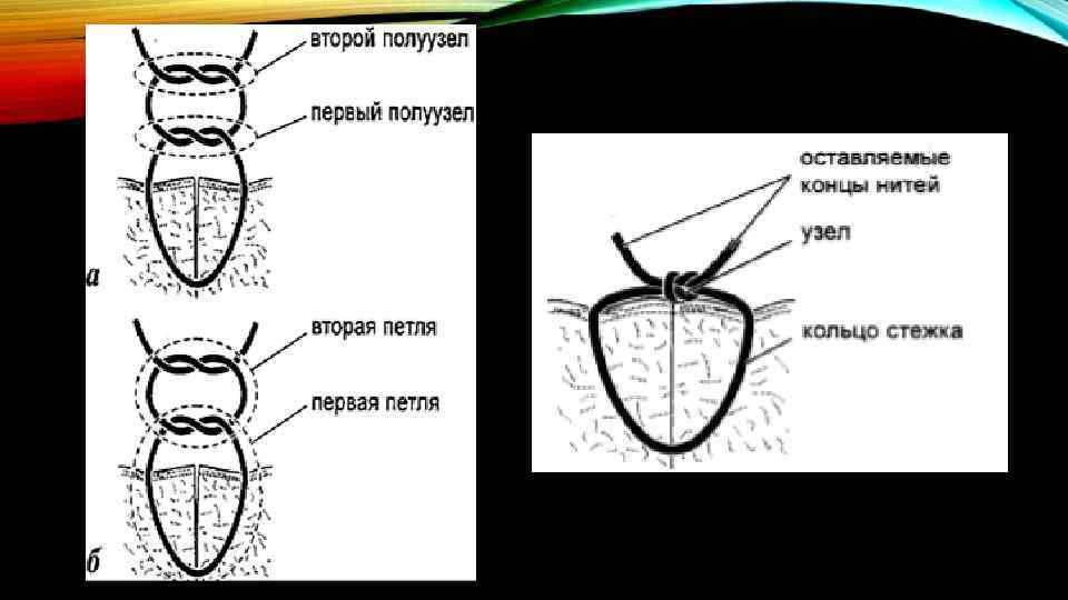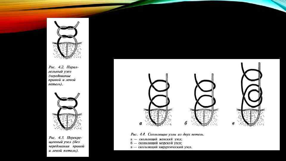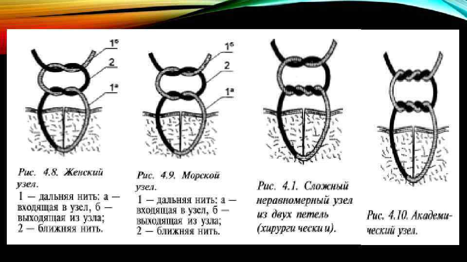 А ТЕПЕРЬ – К ТЕОРИИ • Узел – это переплетение нити или нитей определённой конфигурации, служащее для создания и удержания натяжения без дополнительных усилий извне. • Узел – структура, состоящая из двух и более полуузлов. • Полуузел – основной элемент узла, образованный переплетением нити (нитей) • Узел простой и узел хирургический