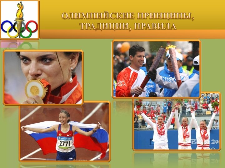 Олимпийская эмблема представляет собой сочетание пяти колец с каким- нибудь другим элементом. Эмблема МОК- олимпийские кольца в сочетании с олимпийским девизом «Быстрее, выше, сильнее» . Национальные олимпийские комитеты стран мира имеют собственные, официальные эмблемы, которыми представляют собой сочетание олимпийского символа с каким- либо национальным отличительным законом. Так, в эмблему Олимпийского комитета России включено трехцветное изображения языка пламени, отражающего цвета Государственного флага РФ. Официальную эмблему Олимпийских игр составляют олимпийский символ (кольца) и какой 0 либо символ города или государства, где проводятся очередные Игры.