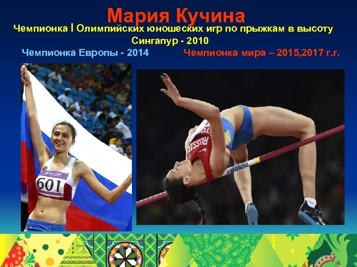 Мария Кучина Чемпионка I Олимпийских юношеских игр по прыжкам в высоту Сингапур - 2010 Чемпионка Европы - 2014 Чемпионка мира – 2015, 2017 г. г.