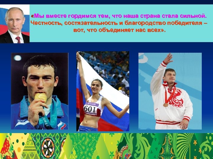 «Мы вместе гордимся тем, что наша страна стала сильной. Честность, состязательность и благородство победителя – вот, что объединяет нас всех» .