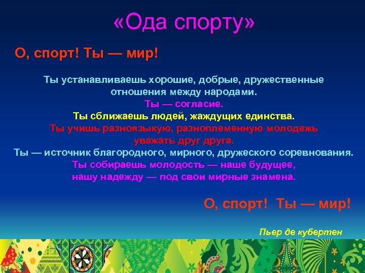 «Ода спорту» О, спорт! Ты — мир! Ты устанавливаешь хорошие, добрые, дружественные отношения между народами. Ты — согласие. Ты сближаешь людей, жаждущих единства. Ты учишь разноязыкую, разноплеменную молодежь уважать друга. Ты — источник благородного, мирного, дружеского соревнования. Ты собираешь молодость — наше будущее, нашу надежду — под свои мирные знамена. О, спорт! Ты — мир! Пьер де кубертен