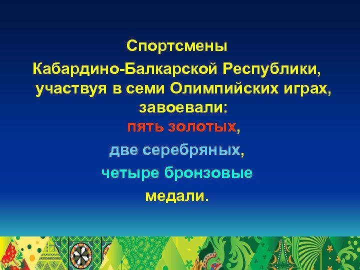 Спортсмены Кабардино-Балкарской Республики, участвуя в семи Олимпийских играх, завоевали: пять золотых, две серебряных, четыре бронзовые медали.
