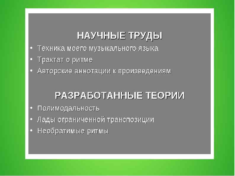 Экзотичесские произведения ● ● ● «Ярави, песнь любви и смерти» (1945) «Турангалила -симфония» для ф-но соло и больш. оркестра(1946 -1948) «Кантейоджайя» (1949)