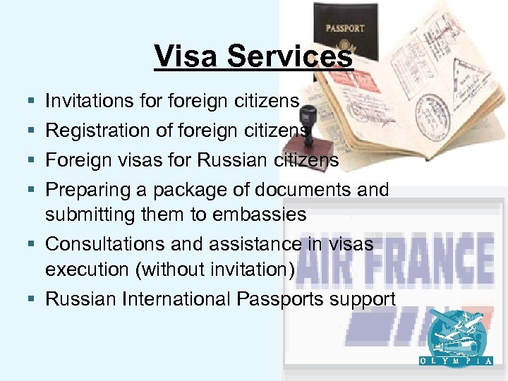 Visa Services § § Invitations foreign citizens Registration of foreign citizens Foreign visas for Russian citizens Preparing a package of documents and submitting them to embassies § Consultations and assistance in visas execution (without invitation) § Russian International Passports support