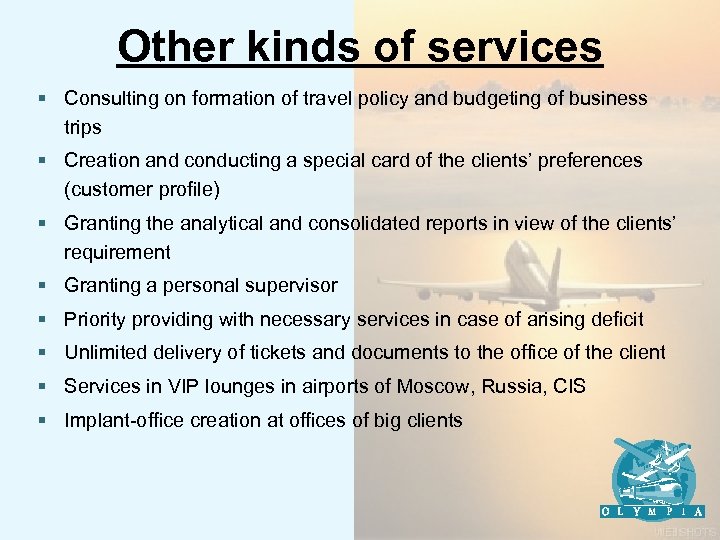 Other kinds of services § Consulting on formation of travel policy and budgeting of business trips § Creation and conducting a special card of the clients’ preferences (customer profile) § Granting the analytical and consolidated reports in view of the clients’ requirement § Granting a personal supervisor § Priority providing with necessary services in case of arising deficit § Unlimited delivery of tickets and documents to the office of the client § Services in VIP lounges in airports of Moscow, Russia, CIS § Implant-office creation at offices of big clients