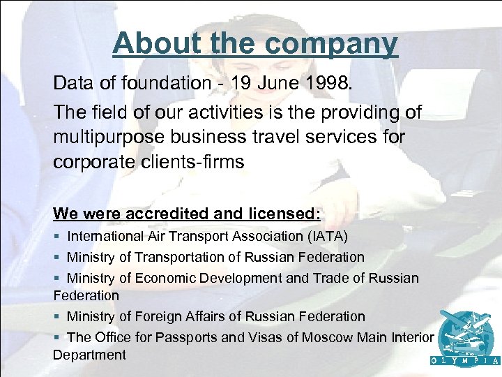 About the company Data of foundation - 19 June 1998. The field of our activities is the providing of multipurpose business travel services for corporate clients-firms We were accredited and licensed: § International Air Transport Association (IATA) § Ministry of Transportation of Russian Federation § Ministry of Economic Development and Trade of Russian Federation § Ministry of Foreign Affairs of Russian Federation § The Office for Passports and Visas of Moscow Main Interior Department