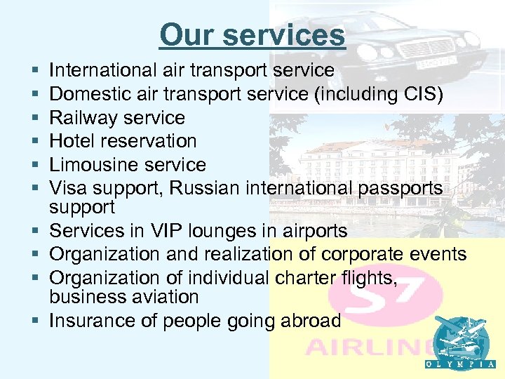 Our services § § § § § International air transport service Domestic air transport service (including CIS) Railway service Hotel reservation Limousine service Visa support, Russian international passports support Services in VIP lounges in airports Organization and realization of corporate events Organization of individual charter flights, business aviation Insurance of people going abroad