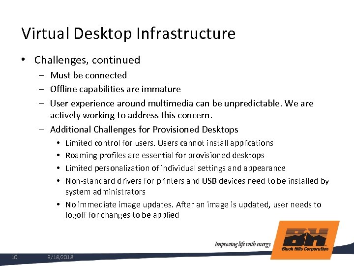 Virtual Desktop Infrastructure • Challenges – Requires additional MS licensing through Software Assurance or VDA – Virtual Desktop technology is dependent on a highly available and low latency networks – User support model changes significantly. May require realignment of IT resources – Windows mobile devices create a challenge. Users need the ability to work in an offline mode. This will be Phase 2 for us – Must get management buy-in in order to be successful – Ensuring we have identified all the user applications that will need to be available as published applications outside of the standard Windows 7 & Office 2010 image 9 3/18/2018