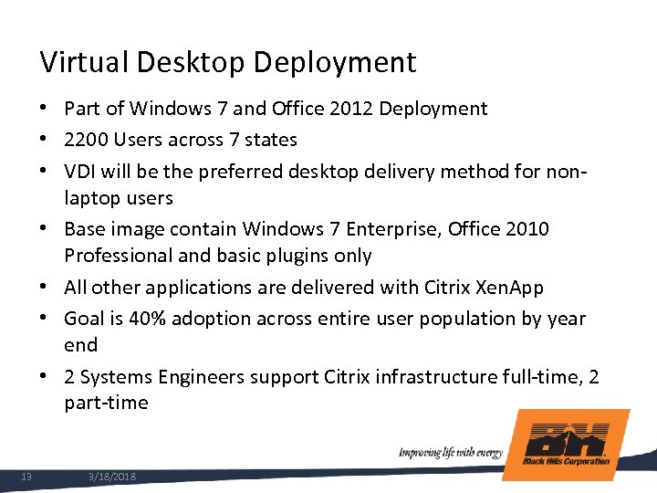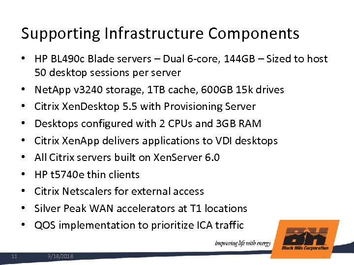 Supporting Infrastructure Components • HP BL 490 c Blade servers – Dual 6 -core, 144 GB – Sized to host 50 desktop sessions per server • Net. App v 3240 storage, 1 TB cache, 600 GB 15 k drives • Citrix Xen. Desktop 5. 5 with Provisioning Server • Desktops configured with 2 CPUs and 3 GB RAM • Citrix Xen. App delivers applications to VDI desktops • All Citrix servers built on Xen. Server 6. 0 • HP t 5740 e thin clients • Citrix Netscalers for external access • Silver Peak WAN accelerators at T 1 locations • QOS implementation to prioritize ICA traffic 11 3/18/2018