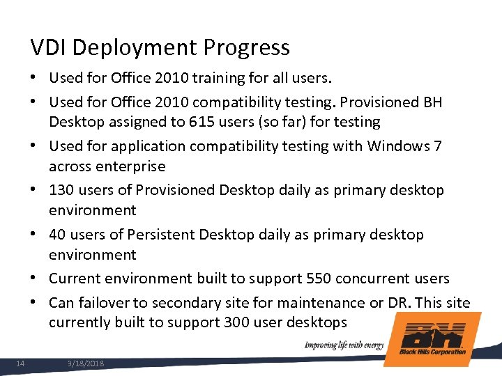 Virtual Desktop Deployment • Part of Windows 7 and Office 2012 Deployment • 2200 Users across 7 states • VDI will be the preferred desktop delivery method for nonlaptop users • Base image contain Windows 7 Enterprise, Office 2010 Professional and basic plugins only • All other applications are delivered with Citrix Xen. App • Goal is 40% adoption across entire user population by year end • 2 Systems Engineers support Citrix infrastructure full-time, 2 part-time 13 3/18/2018