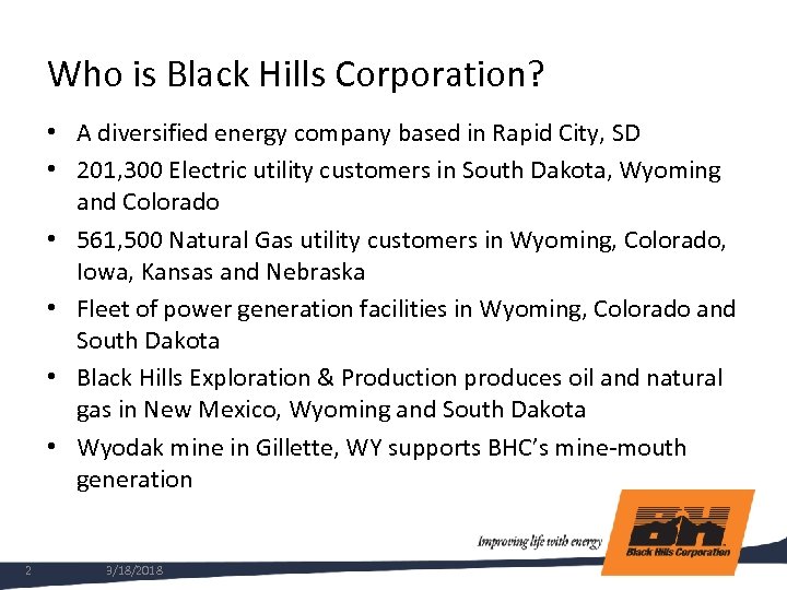 Who is Black Hills Corporation? • A diversified energy company based in Rapid City, SD • 201, 300 Electric utility customers in South Dakota, Wyoming and Colorado • 561, 500 Natural Gas utility customers in Wyoming, Colorado, Iowa, Kansas and Nebraska • Fleet of power generation facilities in Wyoming, Colorado and South Dakota • Black Hills Exploration & Production produces oil and natural gas in New Mexico, Wyoming and South Dakota • Wyodak mine in Gillette, WY supports BHC’s mine-mouth generation 2 3/18/2018
