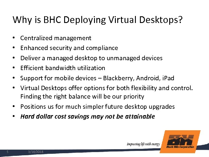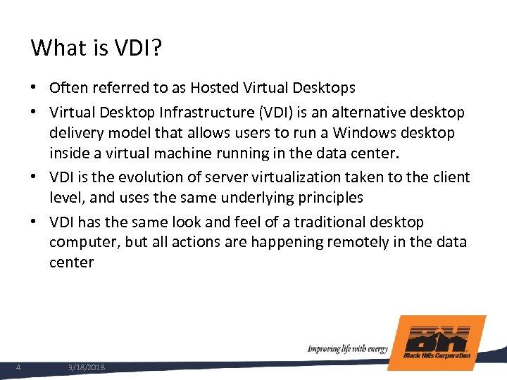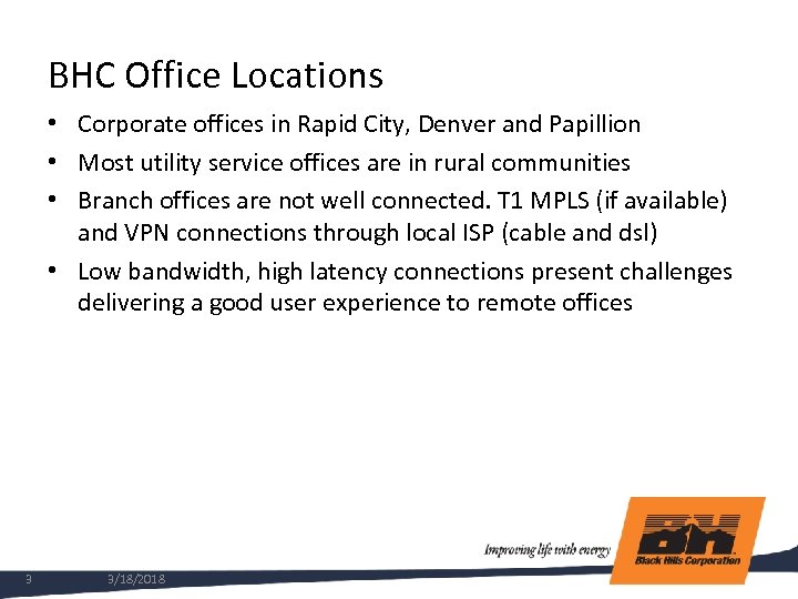 BHC Office Locations • Corporate offices in Rapid City, Denver and Papillion • Most utility service offices are in rural communities • Branch offices are not well connected. T 1 MPLS (if available) and VPN connections through local ISP (cable and dsl) • Low bandwidth, high latency connections present challenges delivering a good user experience to remote offices 3 3/18/2018