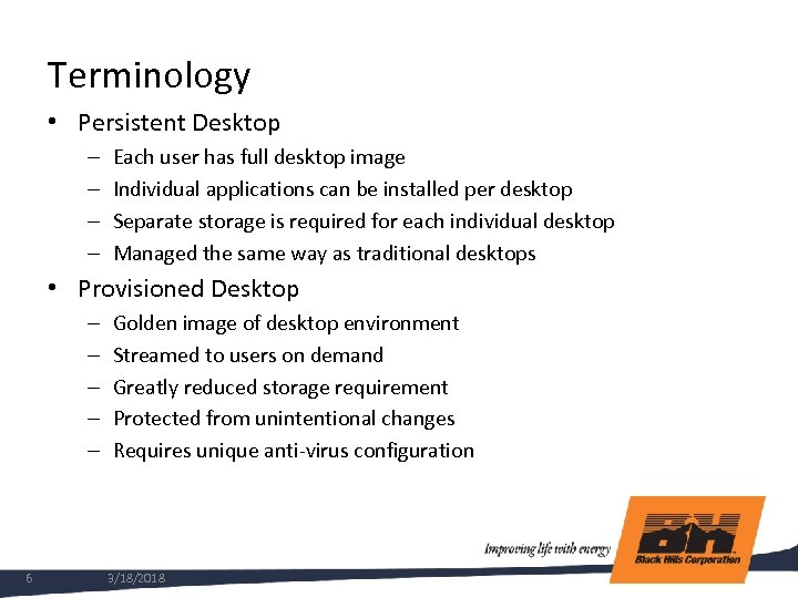 Why is BHC Deploying Virtual Desktops? Centralized management Enhanced security and compliance Deliver a managed desktop to unmanaged devices Efficient bandwidth utilization Support for mobile devices – Blackberry, Android, i. Pad Virtual Desktops offer options for both flexibility and control. Finding the right balance will be our priority • Positions us for much simpler future desktop upgrades • Hard dollar cost savings may not be attainable • • • 5 3/18/2018