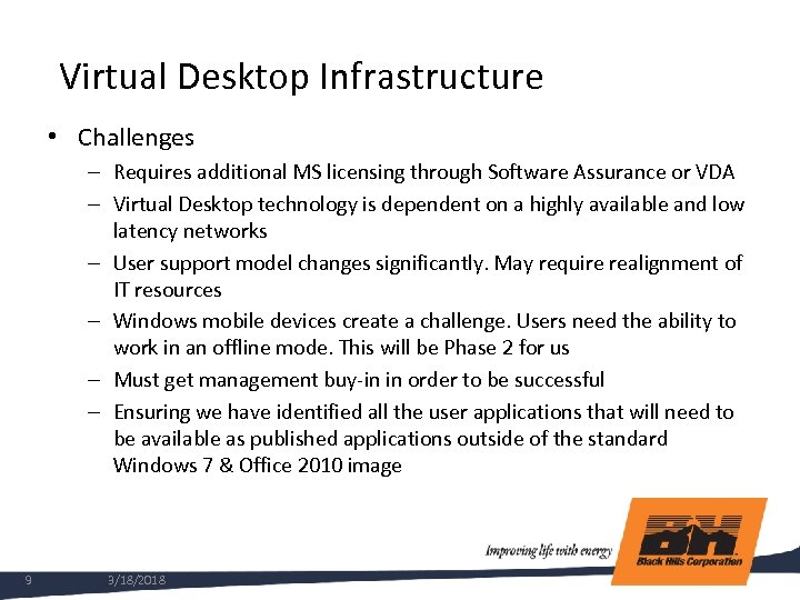 Virtual Desktop Infrastructure • Benefits, continued – Reduce field support travel. Thin clients with no moving parts are less likely to fail. – Strong competition in this market means vendors are actively enhancing and improving their products – Live migration of VMs for availability and similar High Availability solutions like we use with servers. – VDI can offload Flash and Windows Media content to render on local device. This creates a much improved user experience at remote sites. – Reduces power consumption by using thin clients on the desktop and energy efficient servers in the Data Center – Additional Advantages for Provisioned Desktop • Single image to manage • Fast deployments with on demand provisioning • Relatively easy upgrades 8 3/18/2018