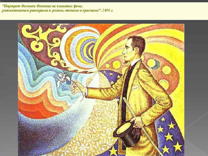 "Портрет Феликса Фенеона на эмалевом фоне, ритмизованном размерами и углами, тонами и красками". 1890 г.