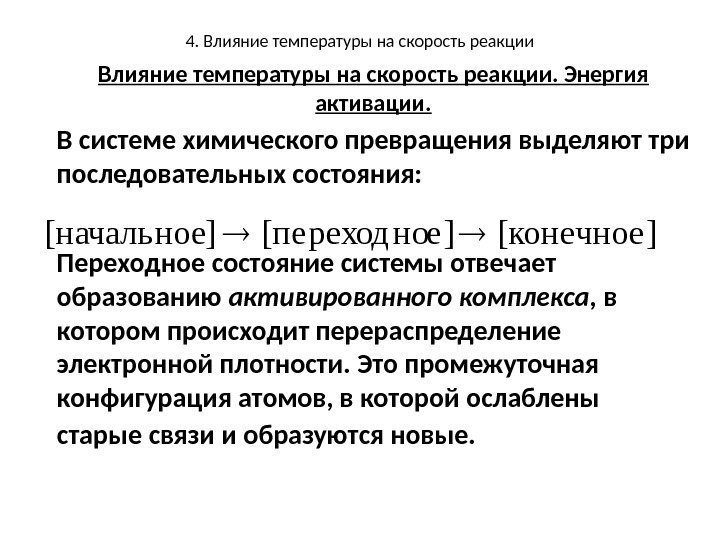 4. Влияние температуры на скорость реакции. Энергия активации. В системе химического превращения выделяют три последовательных состояния: Переходное состояние системы отвечает образованию активированного комплекса , в котором происходит перераспределение электронной плотности. Это промежуточная конфигурация атомов, в которой ослаблены старые связи и образуются новые. [конечное ]е ][пе реход но][начальное