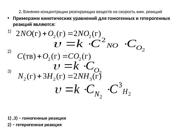 2. Влияние концентрации реагирующих веществ на скорость хим. реакций • Примерами кинетических уравнений для гомогенных и гетерогенных реакций являются: 1) 2) 3) 1) , 3) – гомогенные реакции 2) – гетерогенная реакция)г(2)г()г(2 22 NOОNO )г()г((тв)22 СOОC )г(2)г(322 NHHN 2 2 ONOCCk 2 O Ck 2 2 3 H N CCk