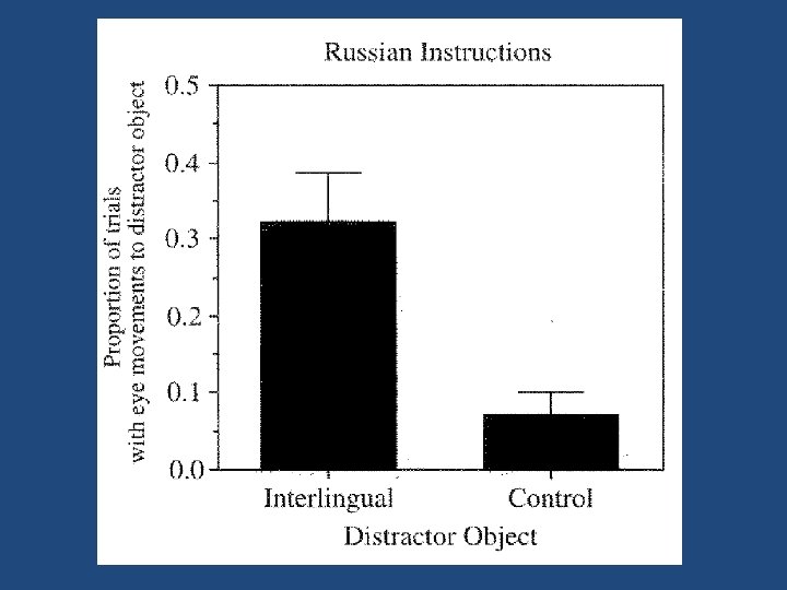 Spivey & Marian (Psychological Science, 1999) • Started from the finding that when people hear a word, initially all words with the same sounds become activated (e. g. , when people hear “beaker”, initially the word “beetle” is acitvated as well). • Shown with the visual world paradigm (e. g. , Allopenna et al. , 1998)