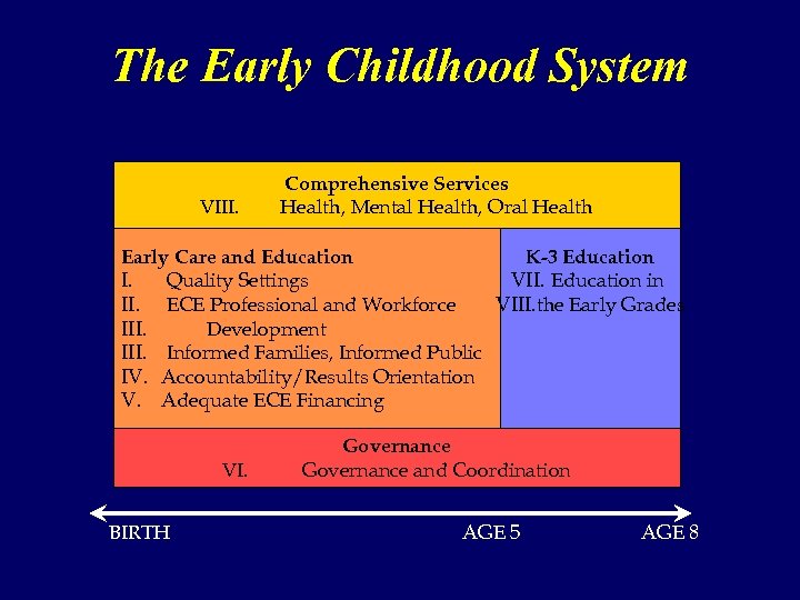 The Early Childhood System VIII. Comprehensive Services Health, Mental Health, Oral Health Early Care and Education K-3 Education I. Quality Settings VII. Education in II. ECE Professional and Workforce VIII. the Early Grades III. Development III. Informed Families, Informed Public IV. Accountability/Results Orientation V. Adequate ECE Financing VI. BIRTH Governance and Coordination AGE 5 AGE 8