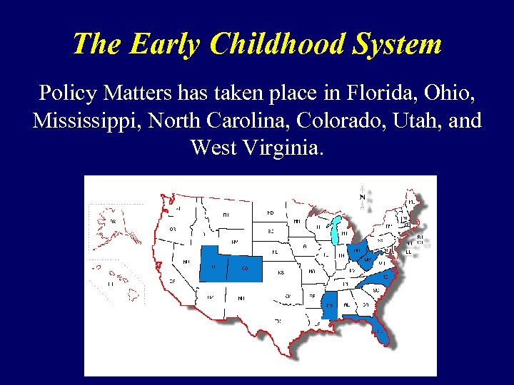 The Early Childhood System Policy Matters has taken place in Florida, Ohio, Mississippi, North Carolina, Colorado, Utah, and West Virginia.