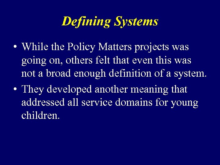 Defining Systems • While the Policy Matters projects was going on, others felt that even this was not a broad enough definition of a system. • They developed another meaning that addressed all service domains for young children.
