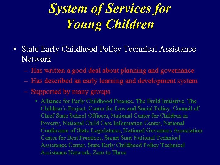 System of Services for Young Children • State Early Childhood Policy Technical Assistance Network – Has written a good deal about planning and governance – Has described an early learning and development system – Supported by many groups • Alliance for Early Childhood Finance, The Build Initiative, The Children’s Project, Center for Law and Social Policy, Council of Chief State School Officers, National Center for Children in Poverty, National Child Care Information Center, National Conference of State Legislatures, National Governors Association Center for Best Practices, Smart Start National Technical Assistance Center, State Early Childhood Policy Technical Assistance Network, Zero to Three