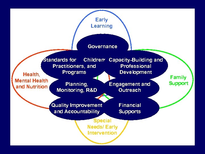 Early Learning Governance Standards for Children, Capacity-Building and Practitioners, and Professional Programs Development Health, Mental Health Planning, Engagement and Nutrition Monitoring, R&D Outreach Quality Improvement and Accountability Special Needs/ Early Intervention Financial Supports Family Support