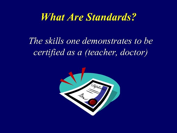 What Are Standards? The skills one demonstrates to be certified as a (teacher, doctor)