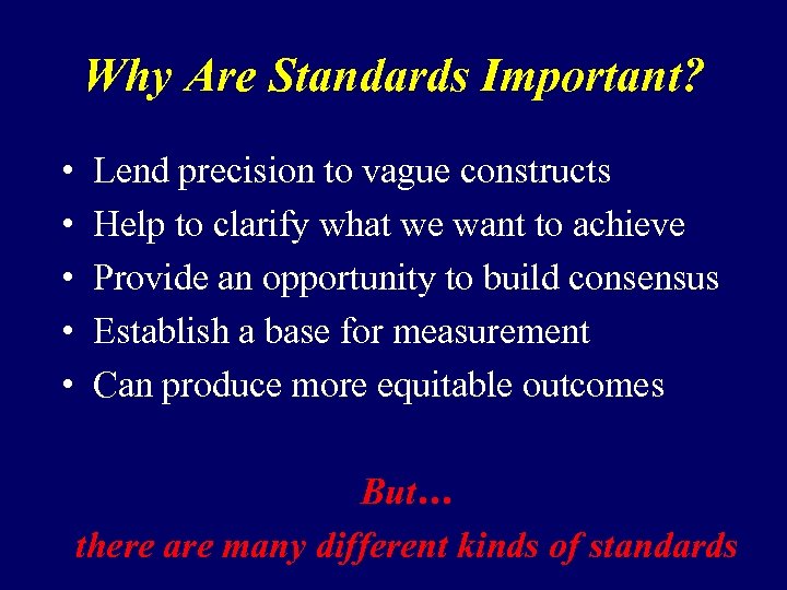 Why Are Standards Important? • • • Lend precision to vague constructs Help to clarify what we want to achieve Provide an opportunity to build consensus Establish a base for measurement Can produce more equitable outcomes But… there are many different kinds of standards