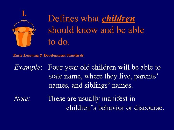 I. Defines what children should know and be able to do. Early Learning & Development Standards Example: Four-year-old children will be able to state name, where they live, parents’ names, and siblings’ names. Note: These are usually manifest in children’s behavior or discourse.
