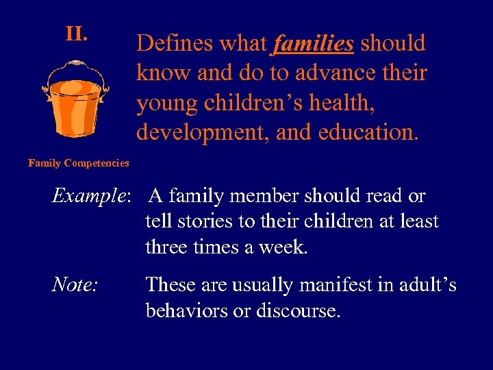 II. Defines what families should know and do to advance their young children’s health, development, and education. Family Competencies Example: A family member should read or tell stories to their children at least three times a week. Note: These are usually manifest in adult’s behaviors or discourse.