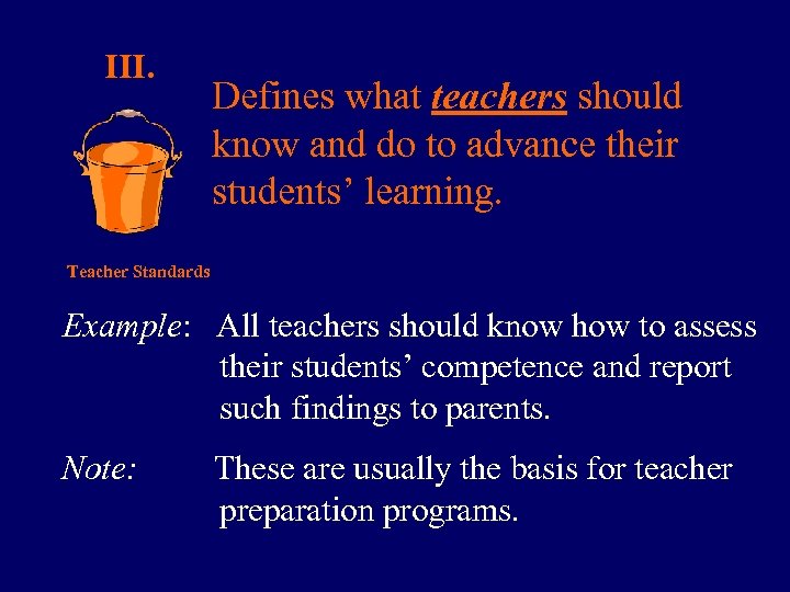 III. Defines what teachers should know and do to advance their students’ learning. Teacher Standards Example: All teachers should know how to assess their students’ competence and report such findings to parents. Note: These are usually the basis for teacher preparation programs.