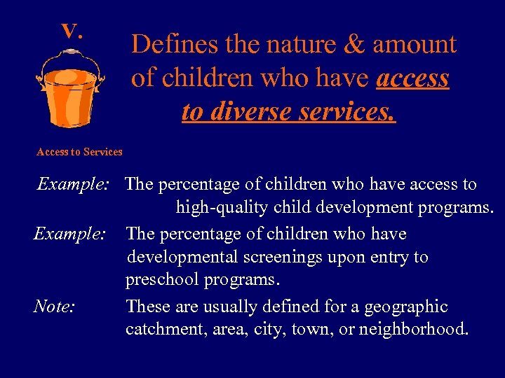 V. Defines the nature & amount of children who have access to diverse services. Access to Services Example: The percentage of children who have access to high-quality child development programs. Example: The percentage of children who have developmental screenings upon entry to preschool programs. Note: These are usually defined for a geographic catchment, area, city, town, or neighborhood.