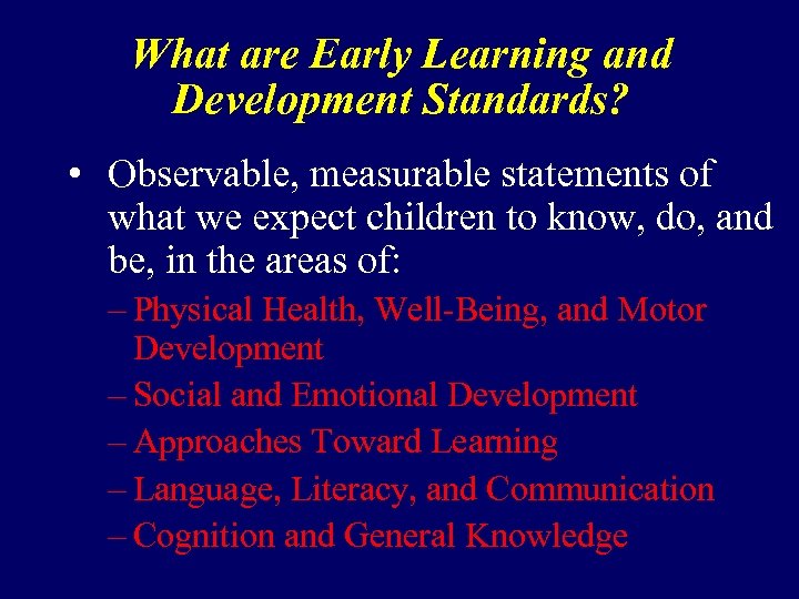 What are Early Learning and Development Standards? • Observable, measurable statements of what we expect children to know, do, and be, in the areas of: – Physical Health, Well-Being, and Motor Development – Social and Emotional Development – Approaches Toward Learning – Language, Literacy, and Communication – Cognition and General Knowledge