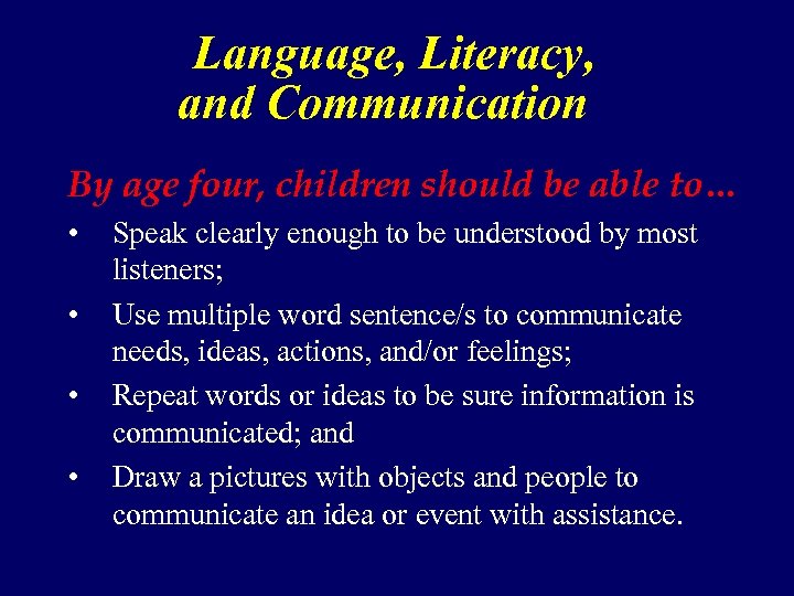 Language, Literacy, and Communication By age four, children should be able to… • • Speak clearly enough to be understood by most listeners; Use multiple word sentence/s to communicate needs, ideas, actions, and/or feelings; Repeat words or ideas to be sure information is communicated; and Draw a pictures with objects and people to communicate an idea or event with assistance.