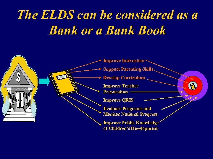 The ELDS can be considered as a Bank or a Bank Book Improve Instruction Support Parenting Skills Develop Curriculum Improve Teacher Preparation Improve QRIS Evaluate Programs and Monitor National Progress Improve Public Knowledge of Children’s Development