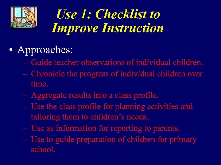 Use 1: Checklist to Improve Instruction • Approaches: – Guide teacher observations of individual children. – Chronicle the progress of individual children over time. – Aggregate results into a class profile. – Use the class profile for planning activities and tailoring them to children’s needs. – Use as information for reporting to parents. – Use to guide preparation of children for primary school.