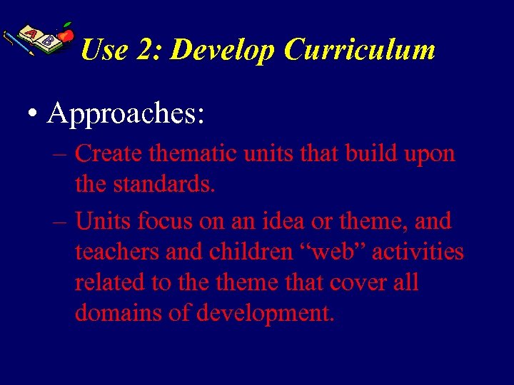 Use 2: Develop Curriculum • Approaches: – Create thematic units that build upon the standards. – Units focus on an idea or theme, and teachers and children “web” activities related to theme that cover all domains of development.