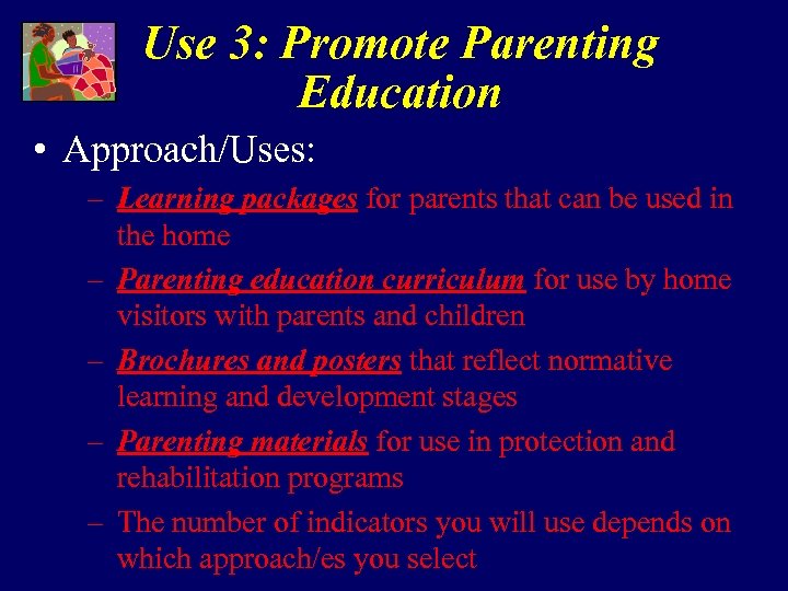 Use 3: Promote Parenting Education • Approach/Uses: – Learning packages for parents that can be used in the home – Parenting education curriculum for use by home visitors with parents and children – Brochures and posters that reflect normative learning and development stages – Parenting materials for use in protection and rehabilitation programs – The number of indicators you will use depends on which approach/es you select