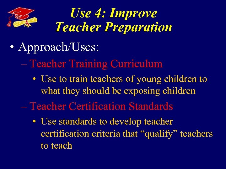 Use 4: Improve Teacher Preparation • Approach/Uses: – Teacher Training Curriculum • Use to train teachers of young children to what they should be exposing children – Teacher Certification Standards • Use standards to develop teacher certification criteria that “qualify” teachers to teach
