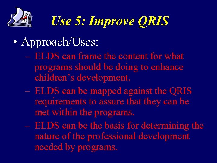 Use 5: Improve QRIS • Approach/Uses: – ELDS can frame the content for what programs should be doing to enhance children’s development. – ELDS can be mapped against the QRIS requirements to assure that they can be met within the programs. – ELDS can be the basis for determining the nature of the professional development needed by programs.