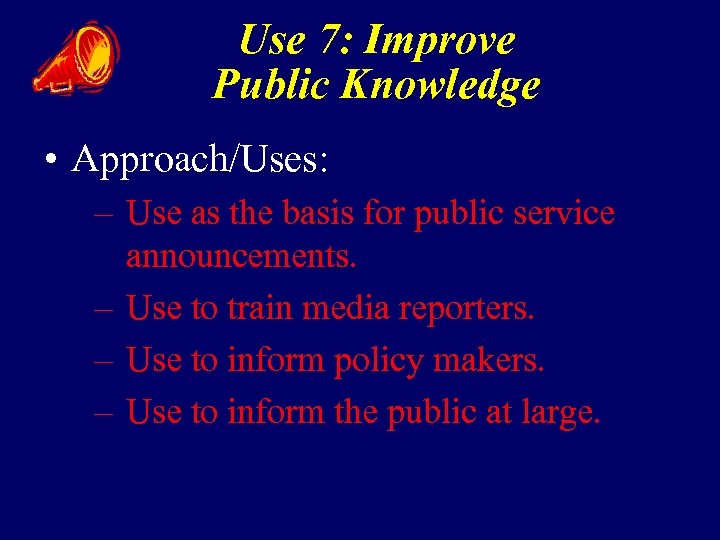 Use 7: Improve Public Knowledge • Approach/Uses: – Use as the basis for public service announcements. – Use to train media reporters. – Use to inform policy makers. – Use to inform the public at large.
