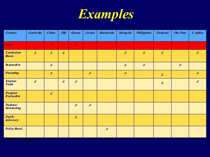 Examples Country Cambodia China Fiji Ghana Jordan Macedonia Mongolia Philippines Thailand Viet Nam S. Africa Uses 2 4 2 3 2 1 3 2 3 1 3 Curriculum Devel. X X X X Instruction X Parenting X Teacher Train X Program Evaluation X X X Public Advocacy X Policy Devel. As of 2006, to be updated X X X x X National Monitoring X X
