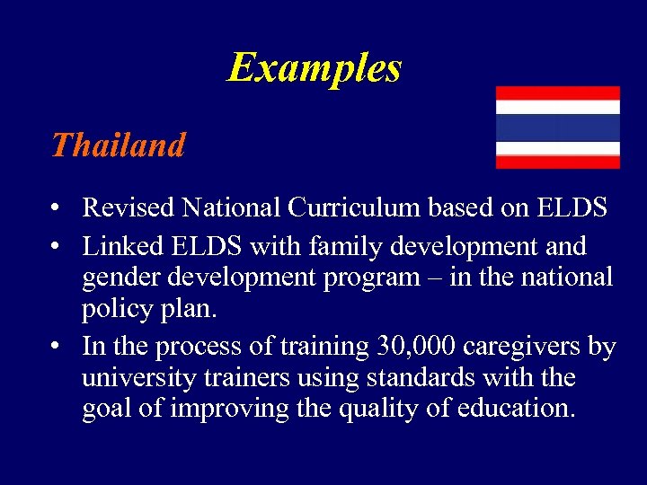 Examples Thailand • Revised National Curriculum based on ELDS • Linked ELDS with family development and gender development program – in the national policy plan. • In the process of training 30, 000 caregivers by university trainers using standards with the goal of improving the quality of education.