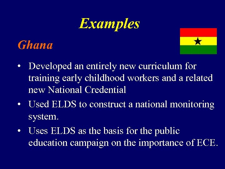 Examples Ghana • Developed an entirely new curriculum for training early childhood workers and a related new National Credential • Used ELDS to construct a national monitoring system. • Uses ELDS as the basis for the public education campaign on the importance of ECE.