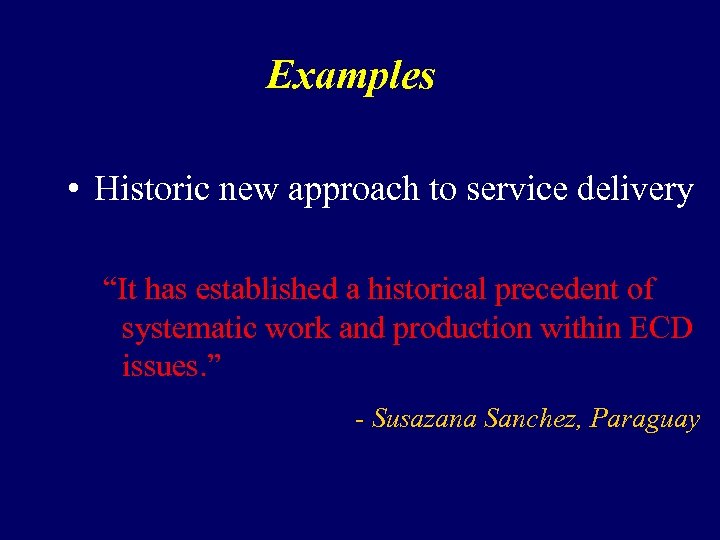 Examples • Historic new approach to service delivery “It has established a historical precedent of systematic work and production within ECD issues. ” - Susazana Sanchez, Paraguay