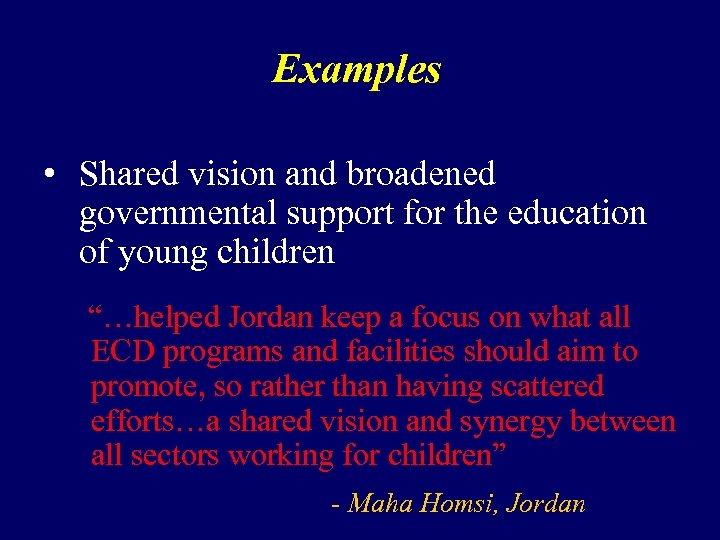 Examples • Shared vision and broadened governmental support for the education of young children “…helped Jordan keep a focus on what all ECD programs and facilities should aim to promote, so rather than having scattered efforts…a shared vision and synergy between all sectors working for children” - Maha Homsi, Jordan