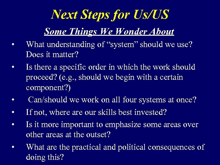 Next Steps for Us/US Some Things We Wonder About • • • What understanding of “system” should we use? Does it matter? Is there a specific order in which the work should proceed? (e. g. , should we begin with a certain component? ) Can/should we work on all four systems at once? If not, where are our skills best invested? Is it more important to emphasize some areas over other areas at the outset? What are the practical and political consequences of doing this?