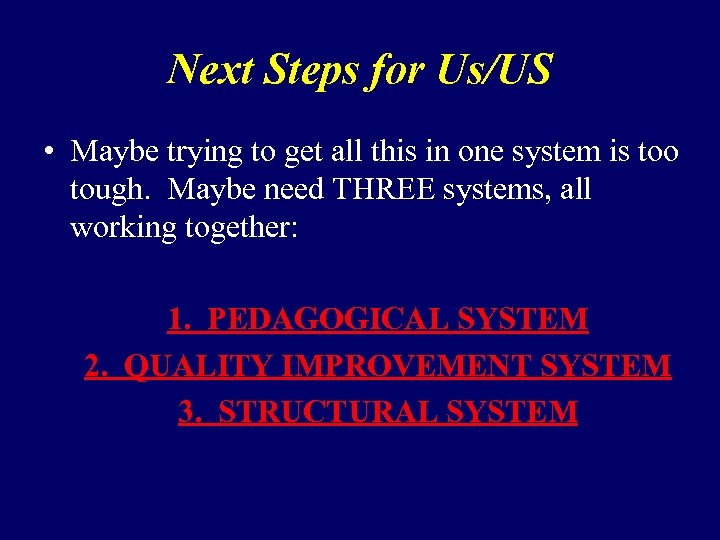 Next Steps for Us/US • Maybe trying to get all this in one system is too tough. Maybe need THREE systems, all working together: 1. PEDAGOGICAL SYSTEM 2. QUALITY IMPROVEMENT SYSTEM 3. STRUCTURAL SYSTEM