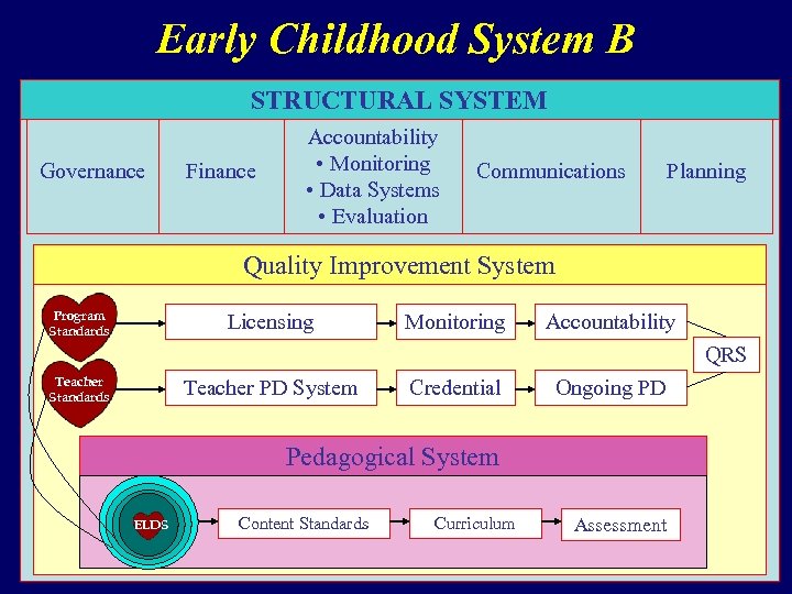 Early Childhood System B STRUCTURAL SYSTEM Governance Finance Accountability • Monitoring • Data Systems • Evaluation Communications Planning Quality Improvement System Program Standards Licensing Monitoring Accountability QRS Teacher Standards Teacher PD System Credential Ongoing PD Pedagogical System ELDS Content Standards Curriculum Assessment